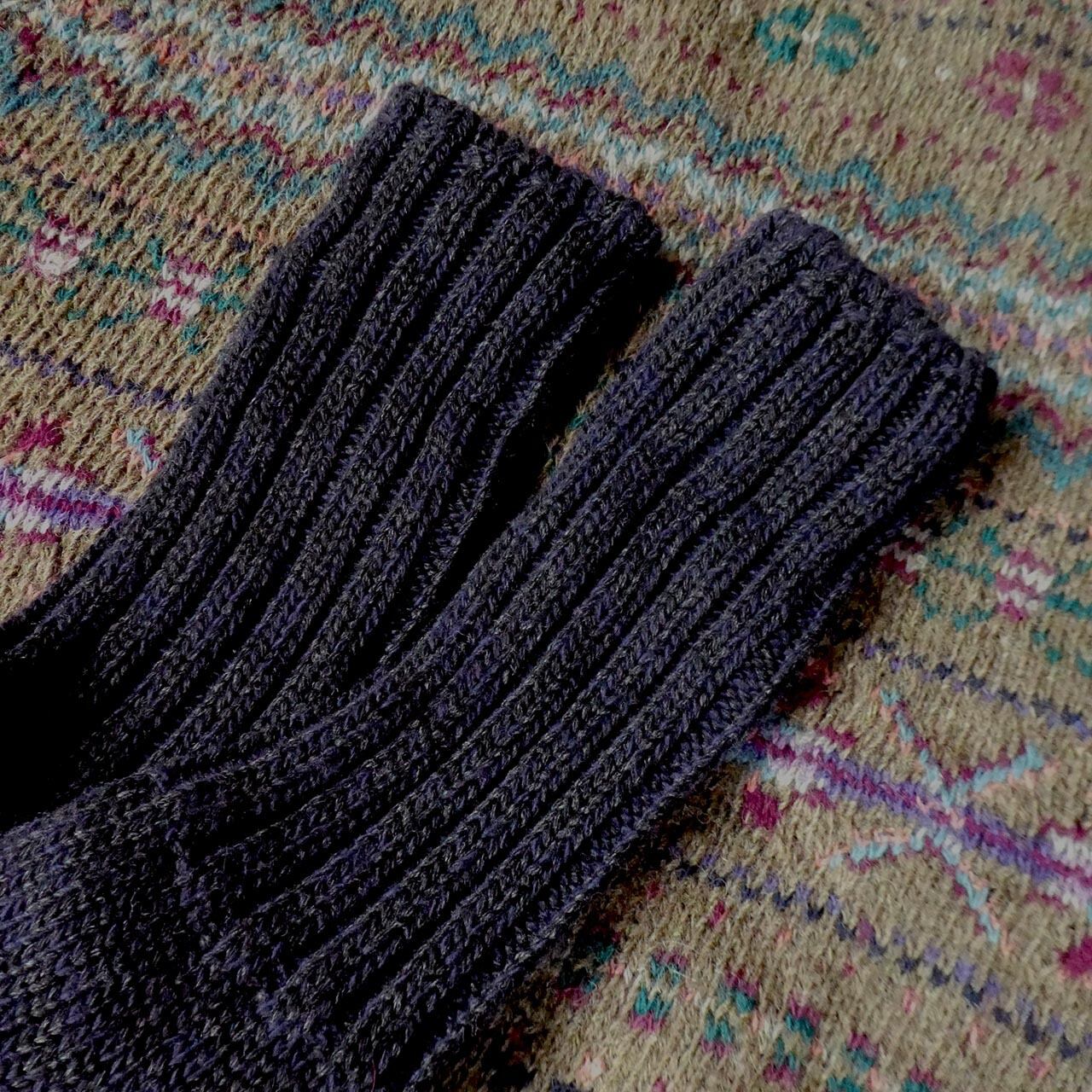 甘撚りのふんわりボリュームのあるウール糸を使い、昔ながらの編み機でテンションをあまりかけずに編み上げています。そうすることで、履き心地柔らかで締め付け感のないソックスが編み上がります。しっかり暖かく、疲れにくい冬のソックスです。